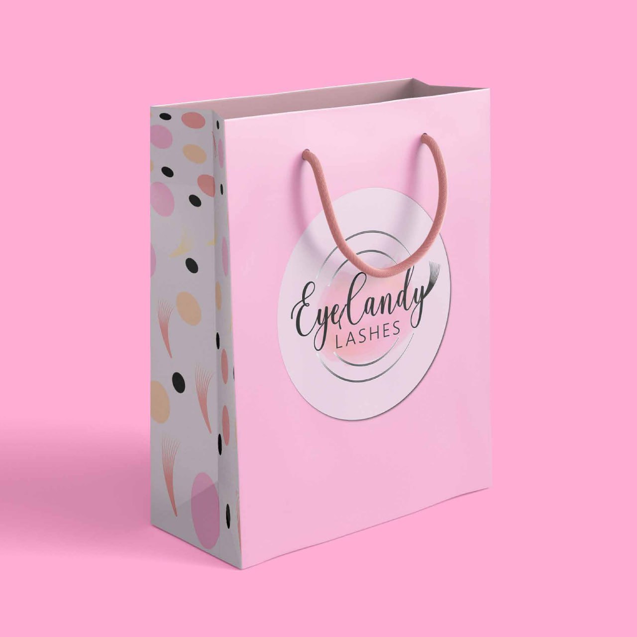 The final design positions Eye Candy Lashes as a go-to beauty brand that feels luxurious yet attainable. The brand’s visuals, tagline (“Good Mood, Good Lashes”), and soft color palette work together to create a cohesive identity that’s primed for social media, product packaging, and retail-ready displays.